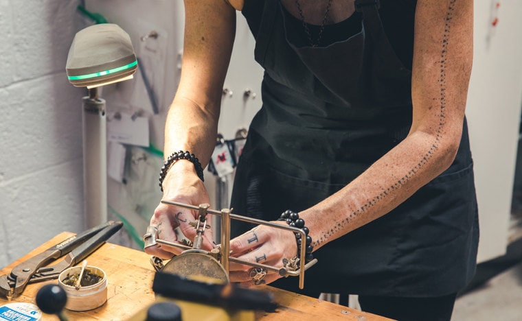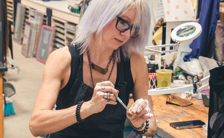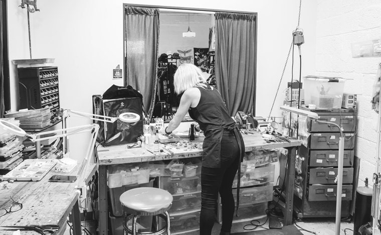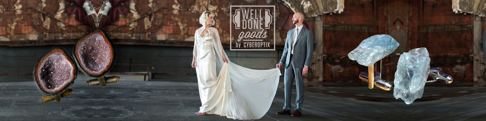 Each pair of cufflinks is unique and one of a kind, and made by hand by printmaker, metalworking artist and Cyberoptix founder, Bethany Shorb. Working between my home base in Detroit, MI and a mobile RV studio Arizona, I source all our stone, crystal, shell and fossil there and at the Tucson and Quartzsite AZ gem shows. All are intuitively sourced in person, from only the most reputable individual suppliers.