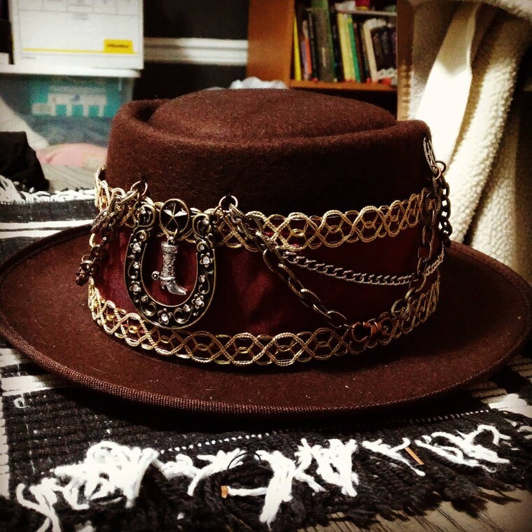 A new western steampunk themed hat. Just wait till you see what else we have in the making. -
