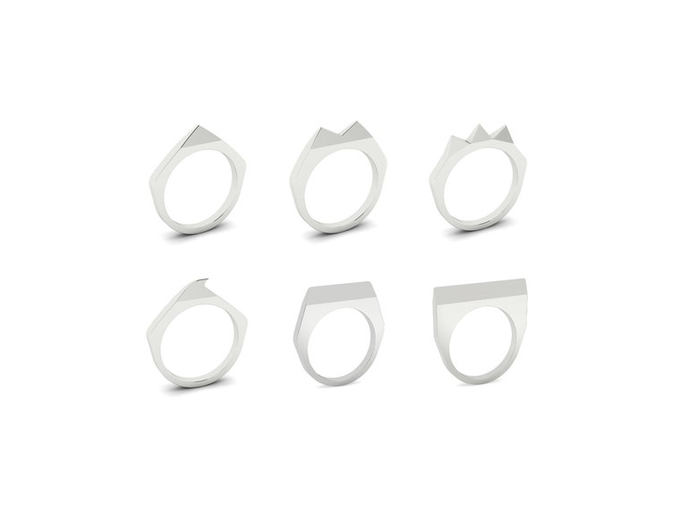 Our 2022 Open Point Ring Collection: From left to right: Solo, Duo, Trio, Crest, Edge, and Block.
