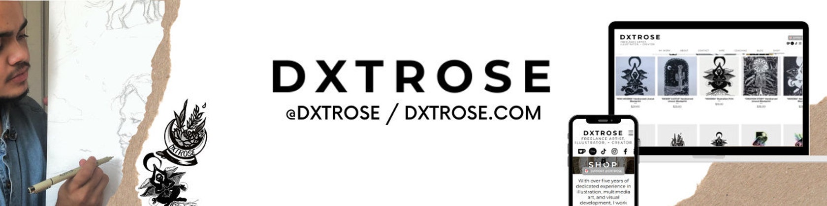 Dexter Komakaru, known under his artist name DXTROSE, is a Freelance Illustrator and Artist working out of his home studio on ancestral and contemporary territory of the Shawnee, Potawatomi, Delaware, Miami, Peoria, Seneca, Wyandotte, Ojibwe and Cherokee peoples, known as CBUS, OH. As a 614 Native born-and-raised, he grew up in what's known as the "bottoms" of the Hilltop Neighborhood near what is now known as the Franklinton Arts District. Viewing his story as his superpower, he uses the hardships he's experienced as fuel for his creative fire.