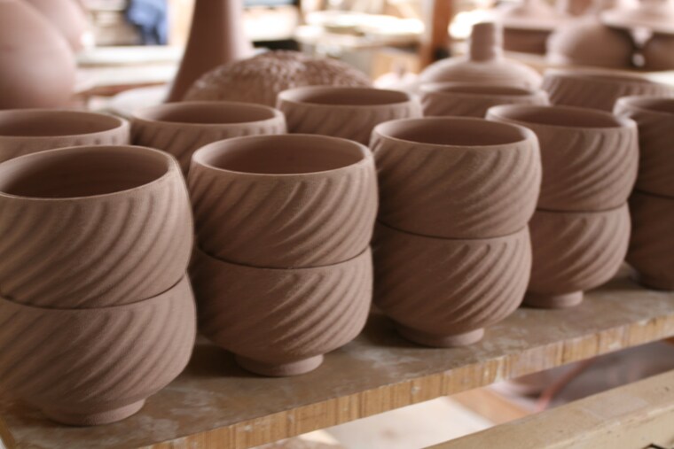 Some finished large work. A perfume bottle a large vase and a sangria bowl. -