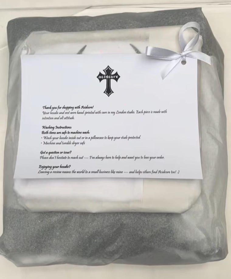 I'm a young designer based in London, creating pieces influenced by y2k, gothic, grunge, punk, and alt streetwear. My brand is about mixing hard and soft styles which are cute but edgy, dark but playful. I hand-make every item from my own studio, from design to packaging. Each piece is designed to feel special, personal, and expressive.