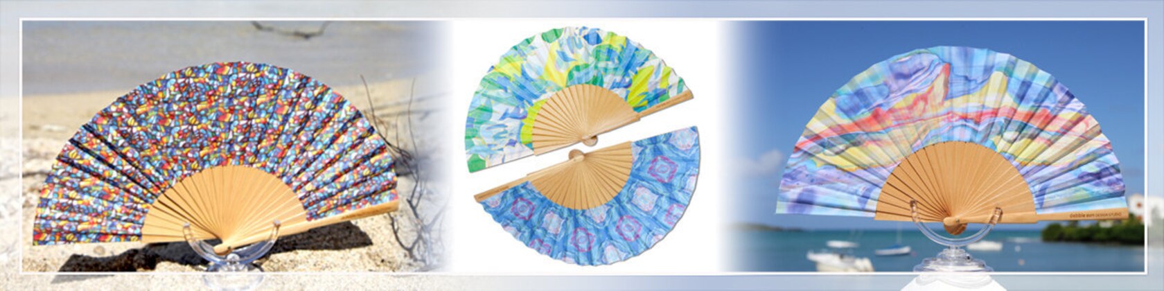 Textile designs come in all shapes and forms and as an artist, I am continually adding exciting new items to the collection ranging from pillows, scarves, note cards and fabulous hand fans. I´m excited that the fans and note cards are now available on Etsy. Check out the website for much more at www.debbiesun.com!
