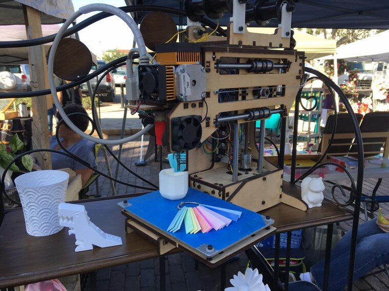 Our first 3-D Printer at a farmer's market table display, and some examples of 3-D printed items & colors we produce. -