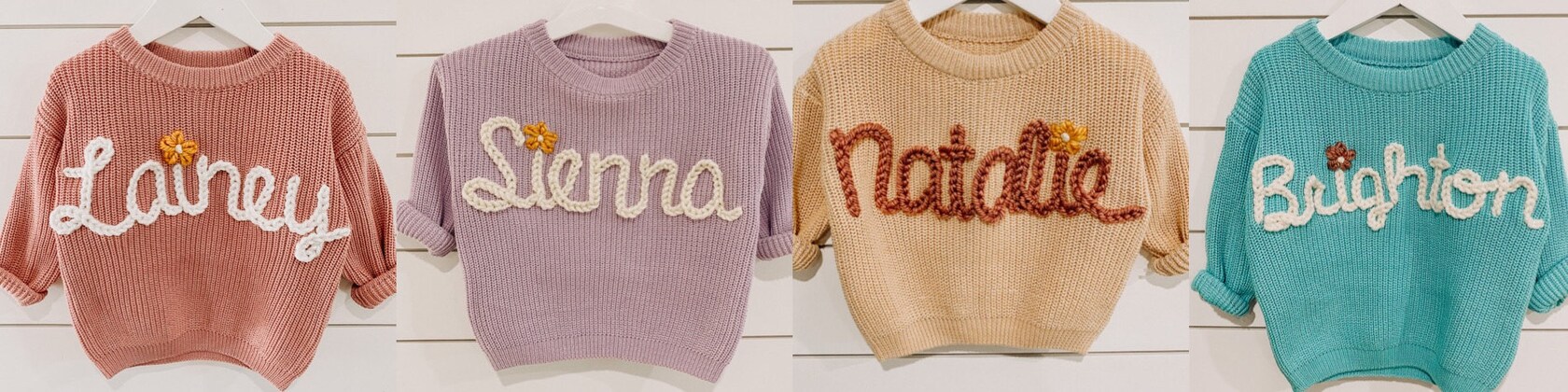 Sweaters are an oversize fit. Each name is hand embroidered by me so no two sweaters will be exactly the same.