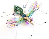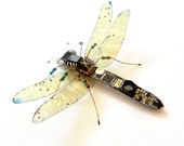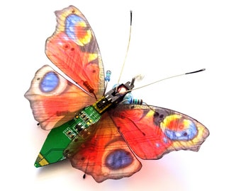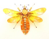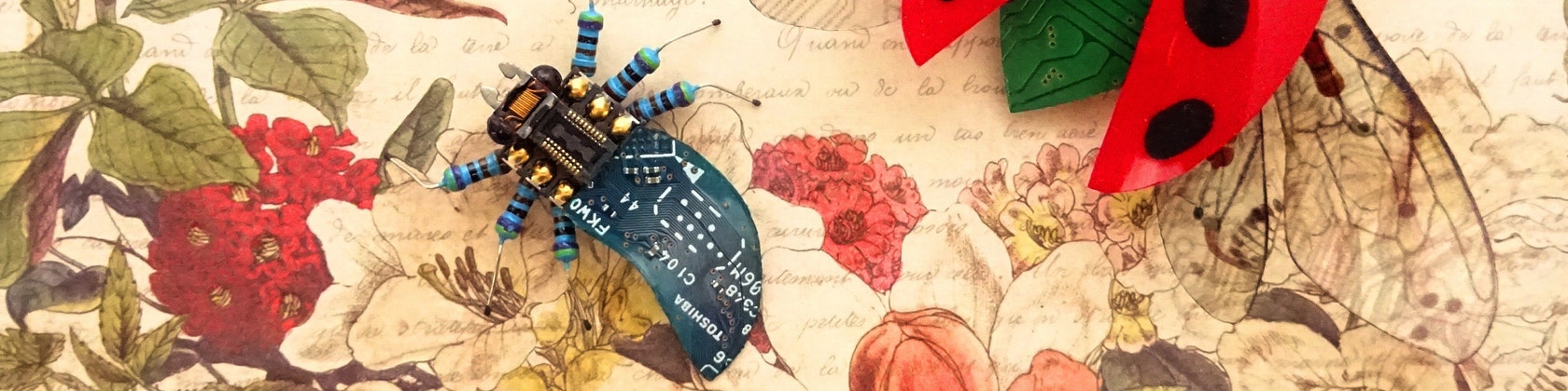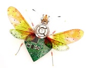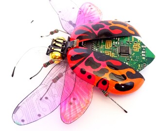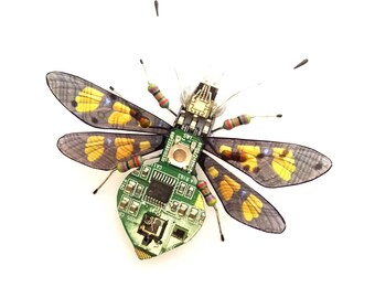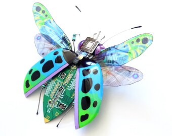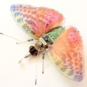 Creating my Insect Sculptures is a long process, from finding and dismantling the electronics and computer gadgets to re-assembling them and adding the artistic touches to create something transformed and re-purposed offering a socio-political discourse and attempting to reclaim waste into the beauty of art. Planned obsolescence: the absurd practice of designing products purposely to have a limited life span in order to maximize profits based on the false notion that infinite economic growth can be balanced by the finite resources of the Earth....this is the major inspiration for my work. I wanted to find a way to bring the theoretical concepts involved into an art form which makes sense in the era in which we live and which relates to current environmental issues. Researching further and seeing the shocking Greenpeace images of computer landfills in natural places I wondered about the creatures that lived at ground level where these things are dumped and I imagined what creatures might survive and evolve centuries from now. It is not all negative though. My art celebrates the beauty of nature along side the ingenuity of mankind and computer technology...even the beauty of circuit boards. There is a constant interaction between digital methods of creativity and traditional practices throughout the making process. I start with hand painting the insect wings in the time consuming and meticulous style of illustrations found in old natural history reference books. Then my paintings are scanned into a computer and I can add some bright bursts of colour, spots and splashes by simply using the basic ‘Paint’ program. Then using the more advance digital design technology such as the ‘Illustrator’ program I can create circuit board patterns which I can change the size of without changing the image quality. These patterns can then be superimposed over my wing paintings...then printed out onto (reused) transparent acetate. Other ‘artistic touches come in the form of hand painting straight onto the Bugs, metal leafing, sculptural manipulation by hand of various components such as wire for the antennae and also sometimes adding little pieces of old jewelry such as glass stones. The display of my Insects involves incorporating both the Victorian entomologist’s wooden display case and diorama ideas with a modern contemporary twist.