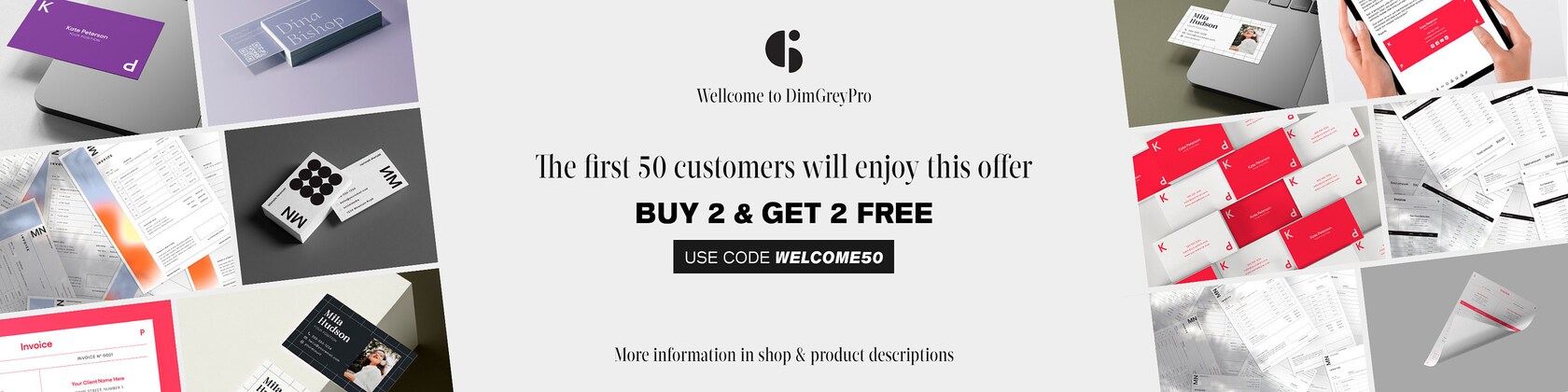 Welcome to DimGreyPro, a quality collection of templates for professionals and freelancers. We aim to provide a uniform and attractive design in your documents that will give you a solid identity for your customers. All our templates are functional, easy to use and perfect for anyone who wants to achieve a solid graphic image and streamline their work. As a graphic designer I have learned the importance of an attractive and professional image. The way you present yourself to your clients is also reflected in the documents you send and share. For that reason I have created these project, so that everyone can create their own professional graphic identity.