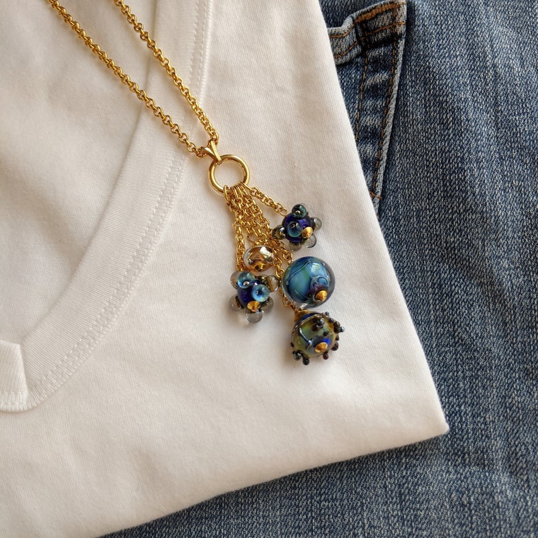 Handcrafted dangle jewelry - earrings, necklaces and bracelets in art glass, gemstone, pearls and glass beads, specialty threads, sterling silver and plated gold. Soft and flirty, fresh, eye catching and bold - multi-faceted color, shapes and textures in handcrafted jewelry for everyday wear. Do dangle!