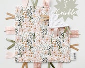 17x17" smaller blanket is perfect for on the go. It's also a great size to introduce to baby, as it is easy for their little hands to carry around. It is a soother, and not intended to "wrap" baby up in. Will cover their lap in carseat. Our lovey blankets include a satin ribbon loop for baby to touch or hold. Easily packs into diaper bag.