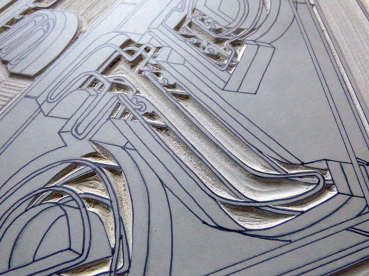 I trace my entire image onto tracing paper and when I'm finished I lay the drawing face down on the surface of the linoleum block and run it through the etching press. The pressure causes the image to transfer onto the block. Next I trace it in a waterproof permanent marker and mark areas with the first letter of the color that belongs there (almost similar to a paint by number, but in my case...ink by letter). After everything is double checked I carve away any areas that will be paper color (bright white is usually my paper color of choice) and I print the first lightest color, I then carve away areas that were associated with that first color, print the next darkest color, carve, print, carve....by the end of the process there is very little surface left to my block.