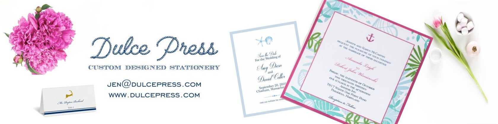 Announcement Custom designed stationery & Gifts. We work with each client to customize colors, fonts and designs until they have everything that they ever hoped for. Visit www.dulcepress.com for more information. Custom designs to match each of our client's personality is what we love to do, special requests and unique designs are encouraged!