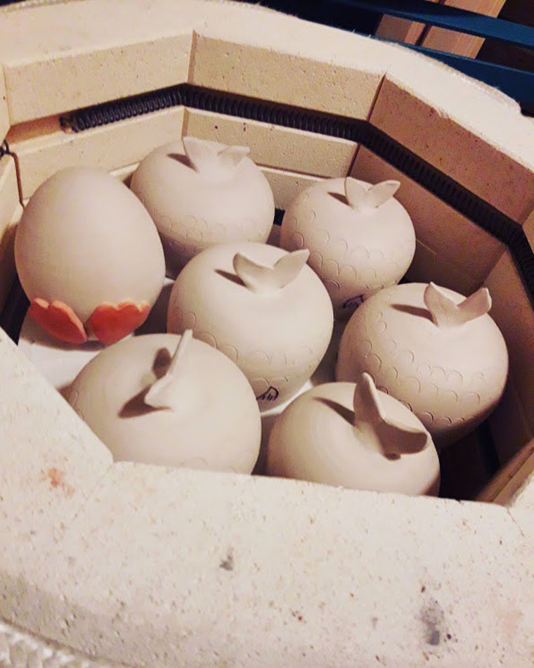 Every piece is fired a minimum of two times. Stoneware is fired at 1240 degrees Celsius.