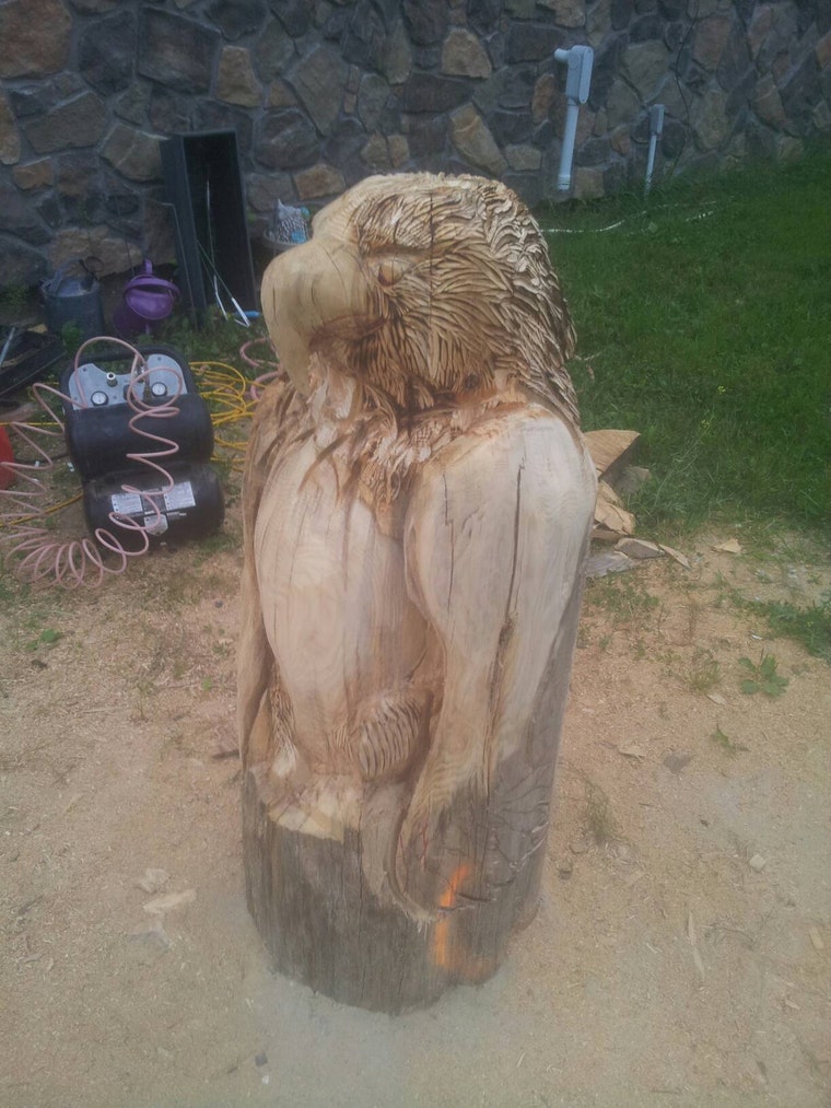 This eagle stands 54"h 20"w I would say it is about 40% complete in this photo. It is for a customer. Showing custom wrk -