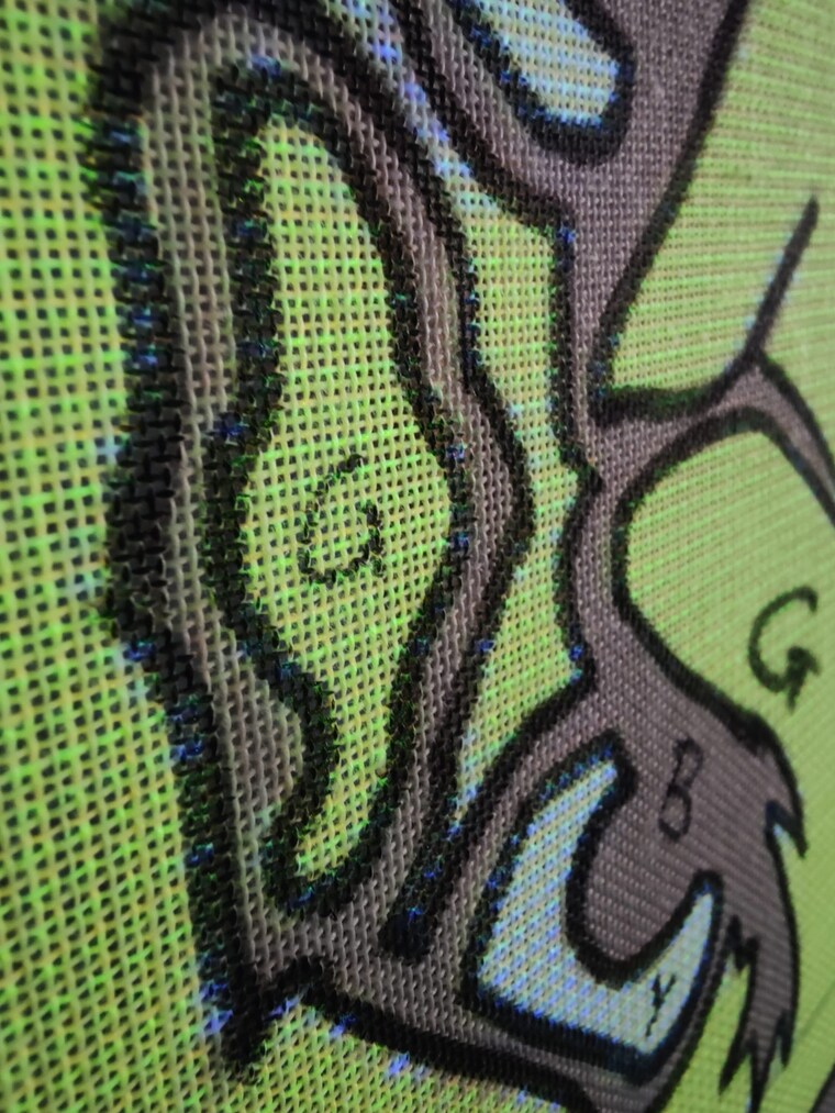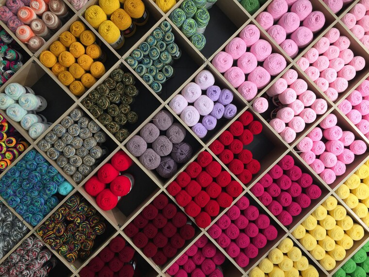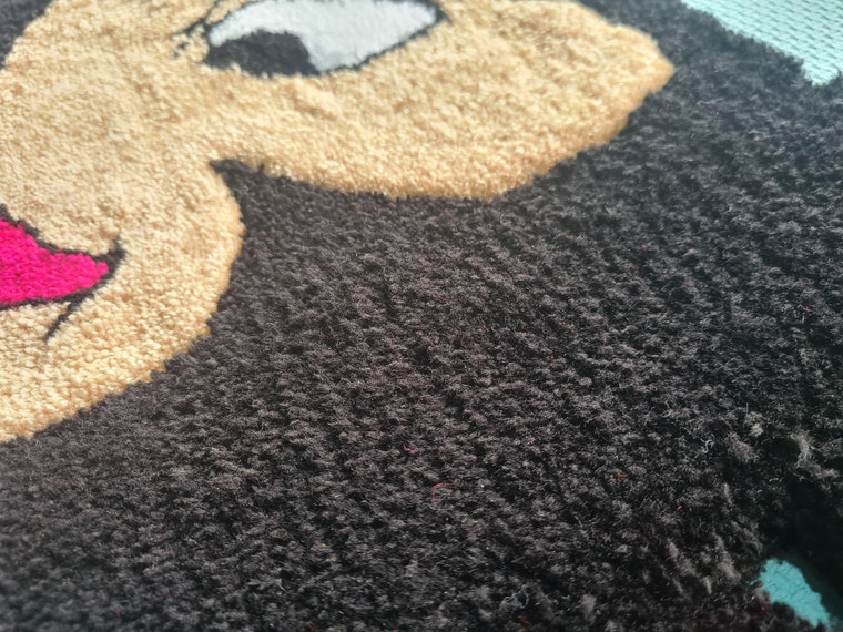 We use a tufting gun to push yarn through a fabric backing, creating the rug’s design. -