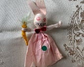 5 out of 5 starsThis paper Easter bunny is adorable! She wears a shabby pink crepe paper dress, and is holding the sweetest pipe cleaner carrot! I love her! Super fast shipping to boot!