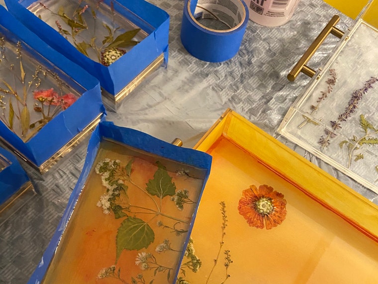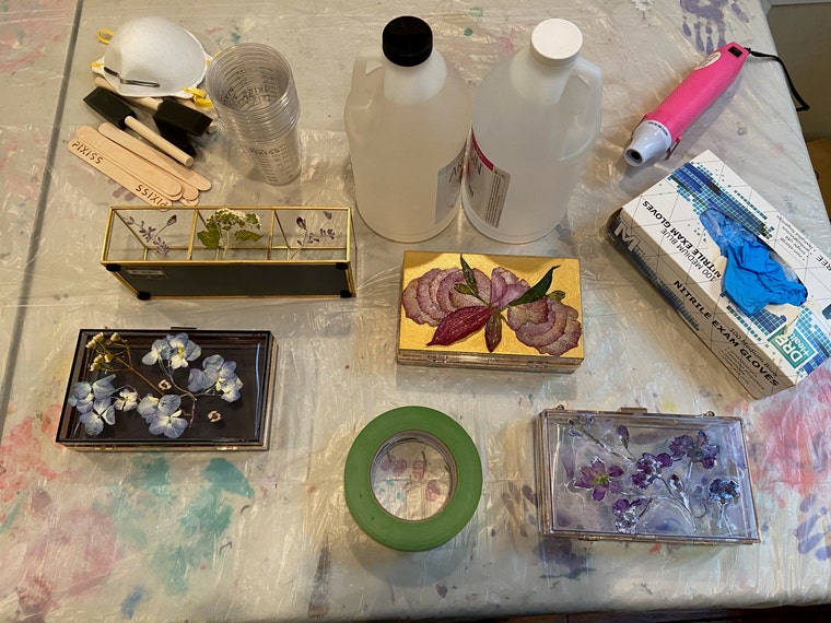 Taped and painted items awaiting layers of resin. -