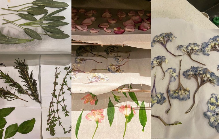 Flowers & herbs during the drying process.