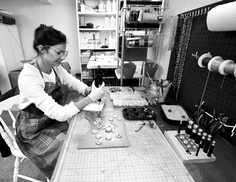 I try to diversify my collection by adding new seasonal specimens each year. In fact, every time I'm going for a nature walk or ride the bike my eyes excitingly scan around for the little treasures. I especially love doing it in the Fall, when there are acorns, pine cones, tree bark and rustling leaves beneath the feet. My work is mostly made to order and is now produced in the little home-studio based in Sharon, MA. I personally grow many of the botanicals I use right in the backyard garden or forage them from the local woods. In 2014 I renamed my store Eight Acorns after my most popular little amber acorn necklace.