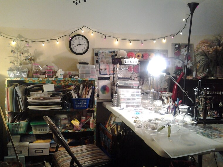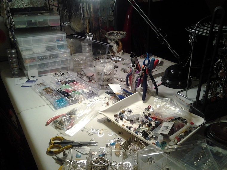 I created a studio space in an unused semi-finished part of the attic in our Cape Cod style home and moved all my supplies up there, and everything clicked into place. Many nights you'll find me upstairs messing with beads or my glue gun with some Nag Champa incense burning and some World Music or rock and roll playing on the stereo. Sometimes my cats Yoshi or Roxy will come up and hang out with me while I'm working.