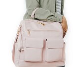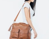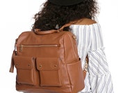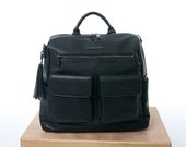 3 out of 5 starsI have to start off by saying I love the way this bag looks! I was happy to see that over time it slouches a little and looks and feels like real leather. I think that the changing clutch is so awesome, however the velcro does get stuck on the designated mesh pocket for the clutch. The addition of a metal name plate and taking away the metal accents on the front pockets makes the bag look even more luxurious. The only thing I wish was different was that there were two insulated pockets. I also find this bag to be HEAVY. I find wearing this bag backpack style, which is the style I intended this bag for, to be pretty uncomfortable. Because of this I will be trying to re sell this bag. Im wondering why the desc says handmade but tags say made in China?