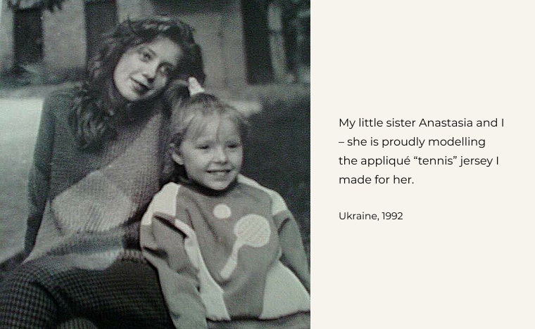 When I was sixteen, I made the appliqué “tennis” jersey for my little sister Anastasia – you can see her proudly modelling in my photos. This early commission won me first prize in a school competition.