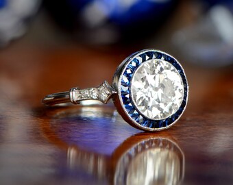 Sapphire Halo Estate Diamond Engagement Ring - 2.24 Carat Antique Old European-Cut Diamond - Natural Calibre-Cut Sapphire Halo