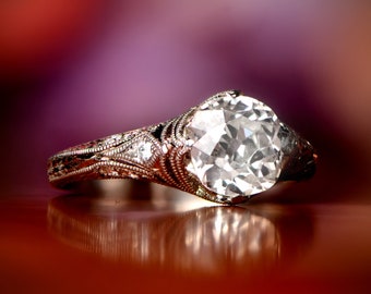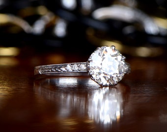 Antique Old European Cut Diamond Engagement Ring - 1.75 Carats - Platinum Ring with Engravings and Filigree