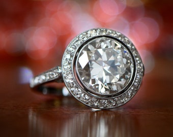 Diamond Gallery Antique Engagement Ring - 3.24 Carat Diamond with Diamond Halo and Milgrain - Circa 1940