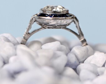 French-Cut Sapphire Halo Ring with 1.06 Old European-Cut Diamond Center - Circa 1920