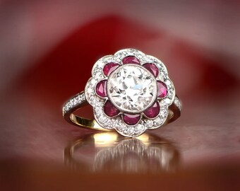Floral Ruby Old European Cut 1.49ct Diamond Engagement Ring