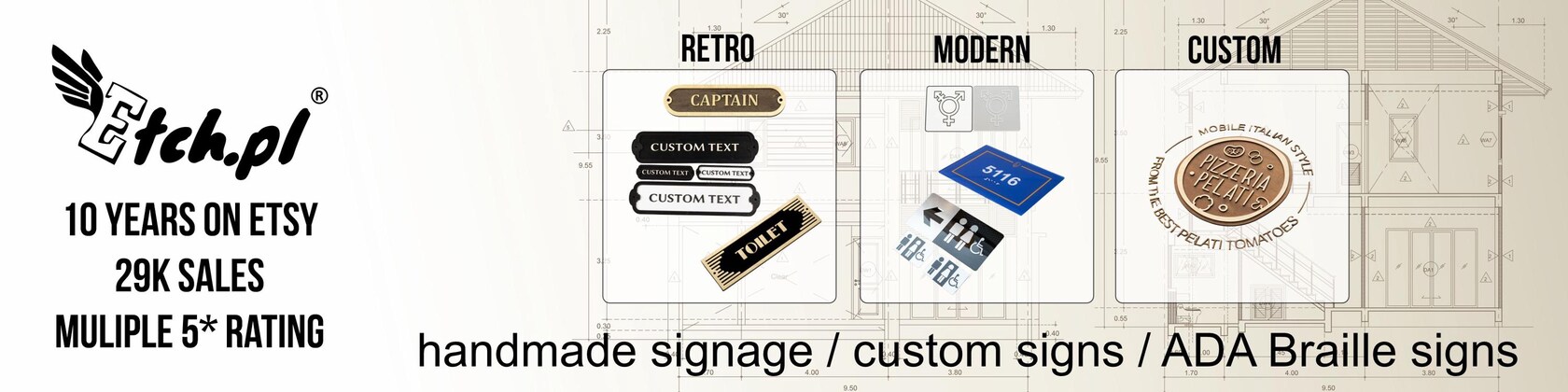 Celebrating 10 years of etch.pl! 🥂 With 28k+ sales and Star Seller status, I craft every custom sign with passion. From a classic wooden door sign to a stylish bathroom sign, I ship my handmade decor to happy homes worldwide. ✨