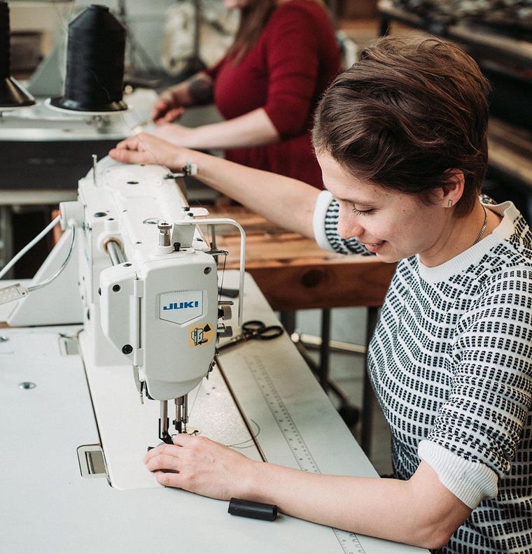 Sewing upcycled inner tube cluthes.