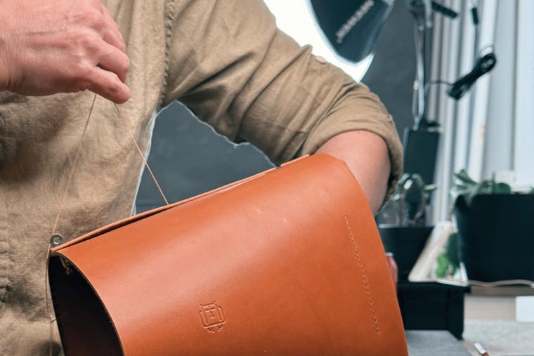 Hand sewing a leather bucket bag. -