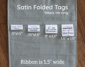 Las etiquetas de satén se imprimen con tinta negra en una cinta de satén blanco.Las etiquetas de satén vienen precortadas y listas para usar: los bordes cortados deben fijarse en una costura o girarse para evitar que la cinta se desenrede.Las etiquetas satinadas son solo tinta negra y los tonos grises no se imprimirán. Los diseños muy detallados no son adecuados para la impresión satinada.