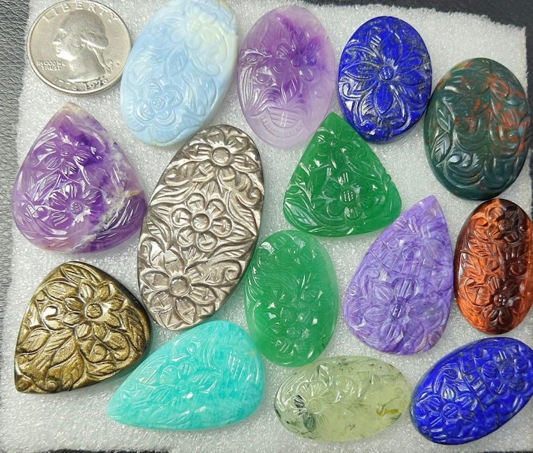 New carved gemstones, setting into Sterling Silver. Coming soon! -