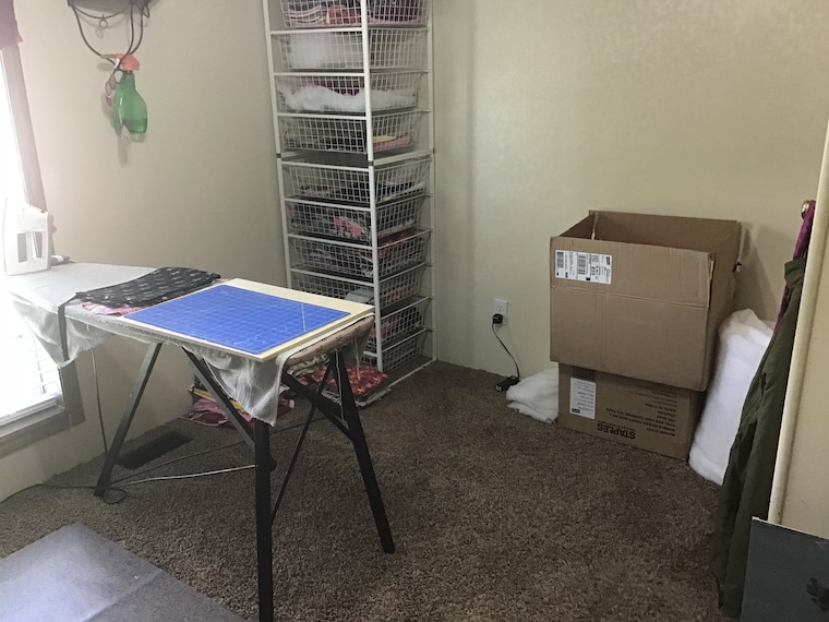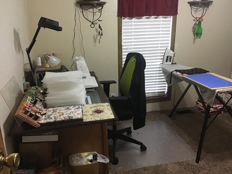 Another view of my workspace, I’m thinking I need to add some storage for my fabric addiction. -