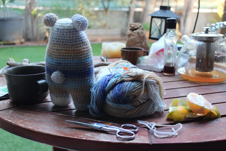 My partner helps me photograph my crochet items, which allows me to wear/interact with them and it's more fun together!