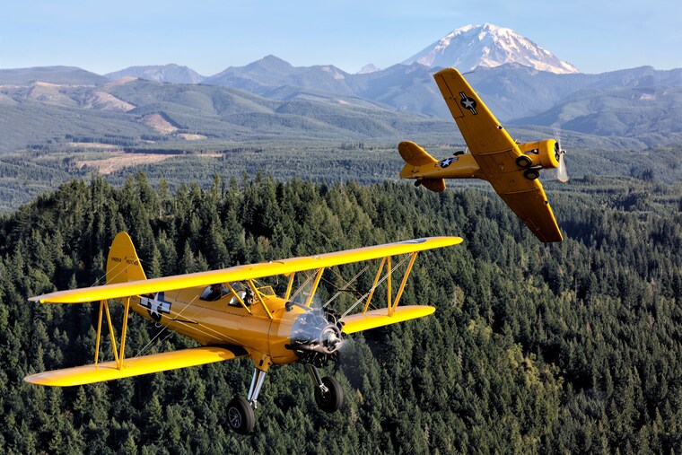 A North American T6-G Texan peels away from a Stearman in close formation with Mt. Rainier in the background. -
