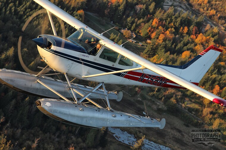 A beautiful Cessna 172 on floats during an evening flight over the fall colors.