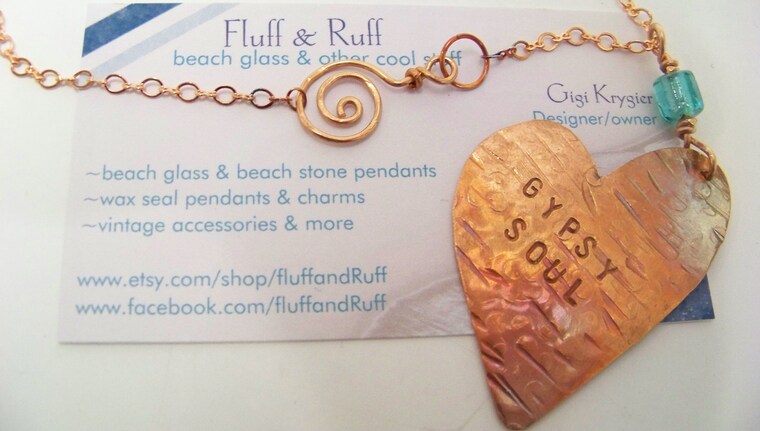 Fluff & Ruff now includes precious metal clay pendants, stamped and forged copper jewelry, etched metals, enameled copper, and hand-beaded and wire-wrapped chains.