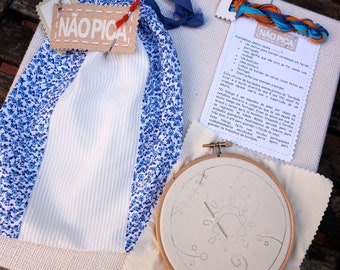 Stamped embroidery kit tutorial, handmade DIY gifts for friends, Needlework kit with embroidery supplies and floral pattern from Portugal