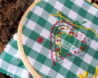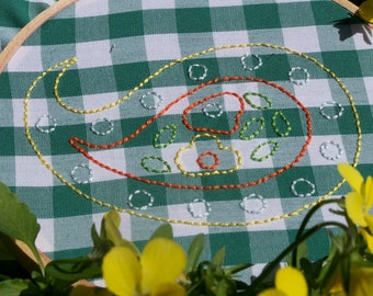 Paisley Printed Embroidery pattern pack -hand stamped on green & white gingham fabric with needlework supplies