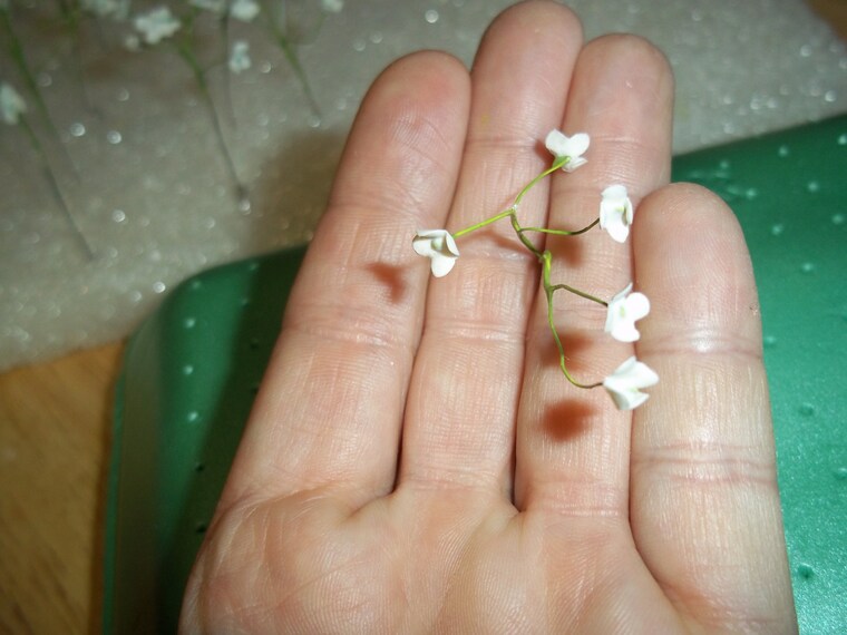 I am holding some tiny flowers used like Babys Breath in bouquets. I hand form every tiny bud, flower, petal and leaf. -