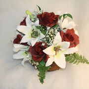 Here is a completed bouquet including White Lilies, Red Roses, Babys Breath, Bluetts, assorted Ferns and other Greenery