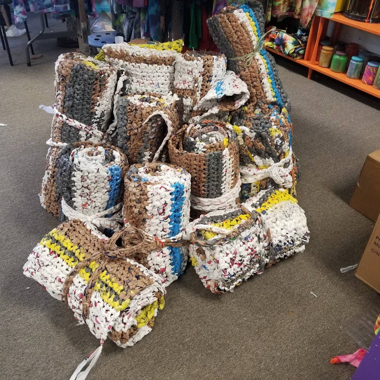 Mats for the homeless from our charity program made from recycled plastic bags. -