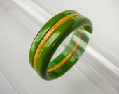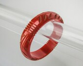5 out of 5 starsRed carved bakelite vintage bangle. Orange-red color. Faint yellow shading inside carved leaves and other carving gives it depth. Looks like an Asian antique. Elegant. Classic.