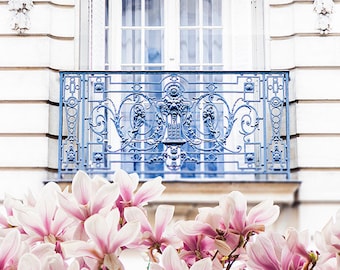 Paris Photography - Magnolia Blossoms under Balcony, Spring in Paris, Architecture Photograph, Travel Fine Art Photograph, Large Wall Art