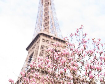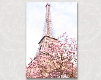 Paris Photo on Canvas, Magnolias at the Eiffel Tower, Roses, Gallery Wrapped Canvas, Large Wall Art, French Travel Home Decor