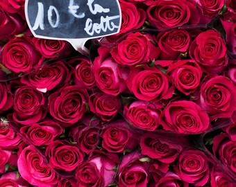 Paris Photograph - Crimson Roses in Paris Market, French Travel Photograph, Large Wall Art, Romantic Home Decor
