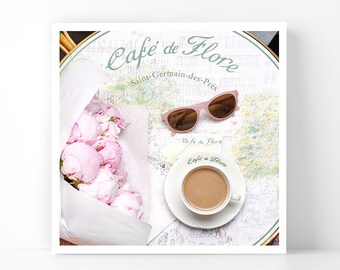 Paris Photography - Peonies at Cafe de Flore, 5x5 Paris Fine Art Photograph, French Home Decor, Wall Art, Paris Gallery Wall